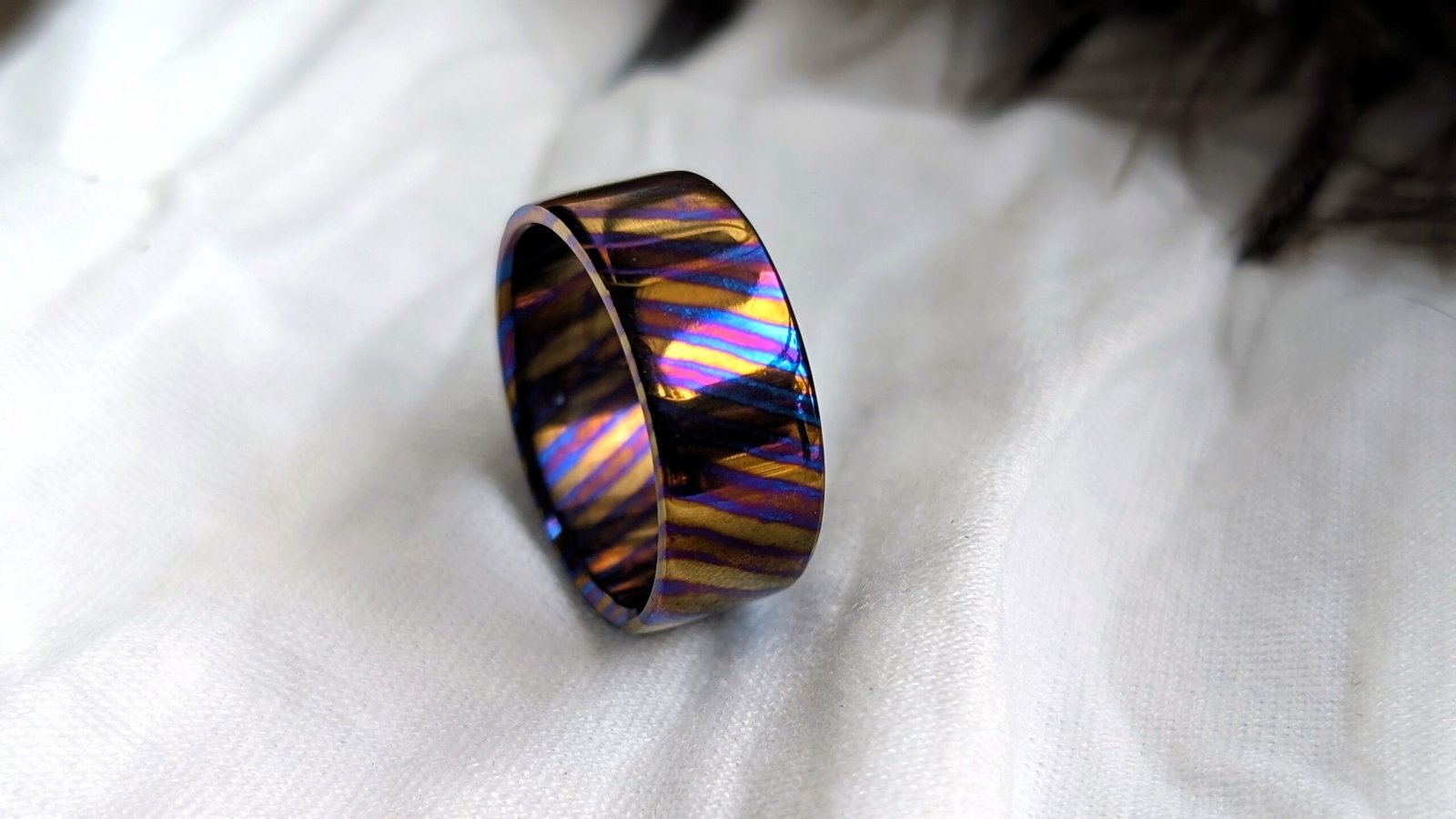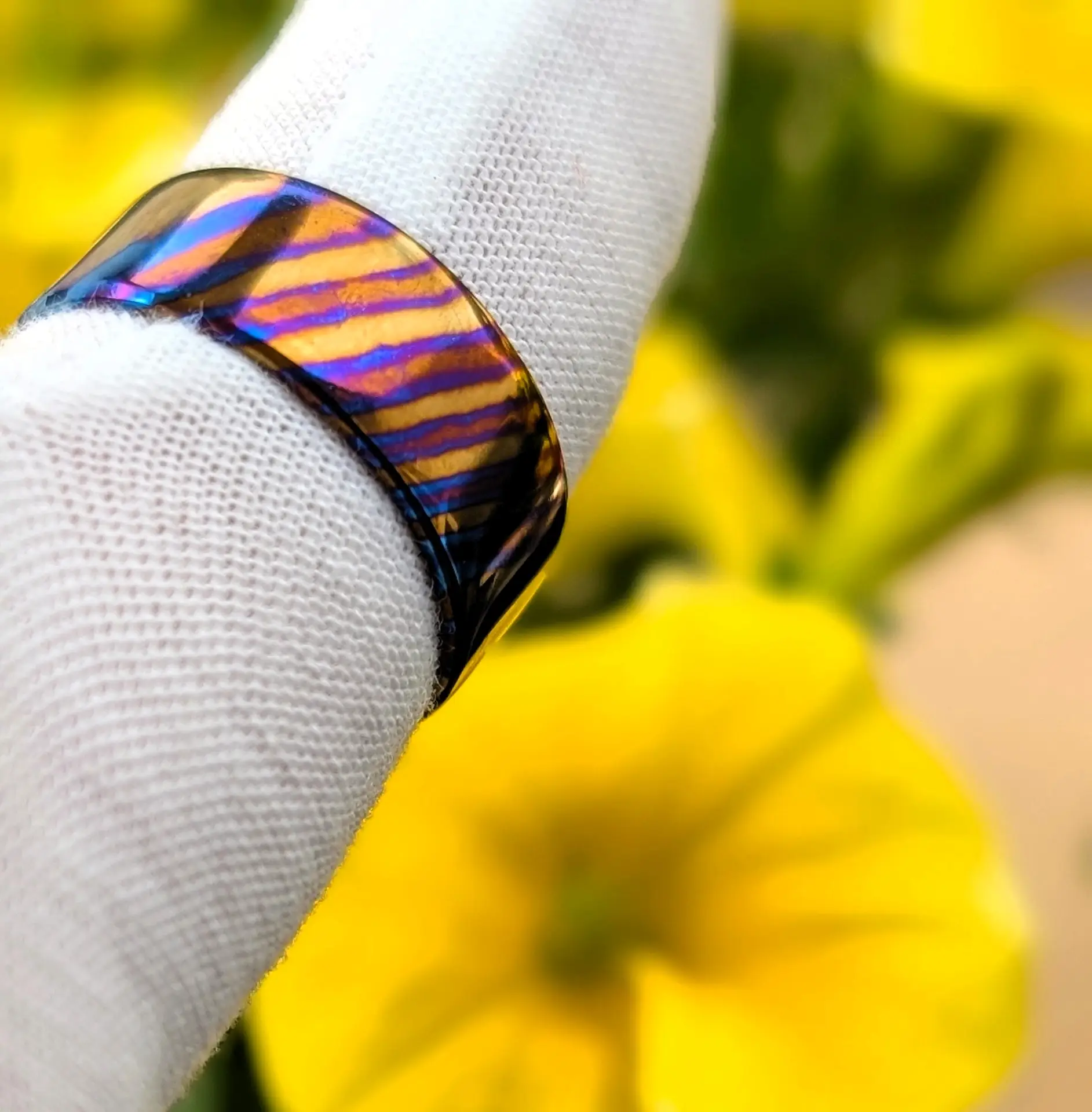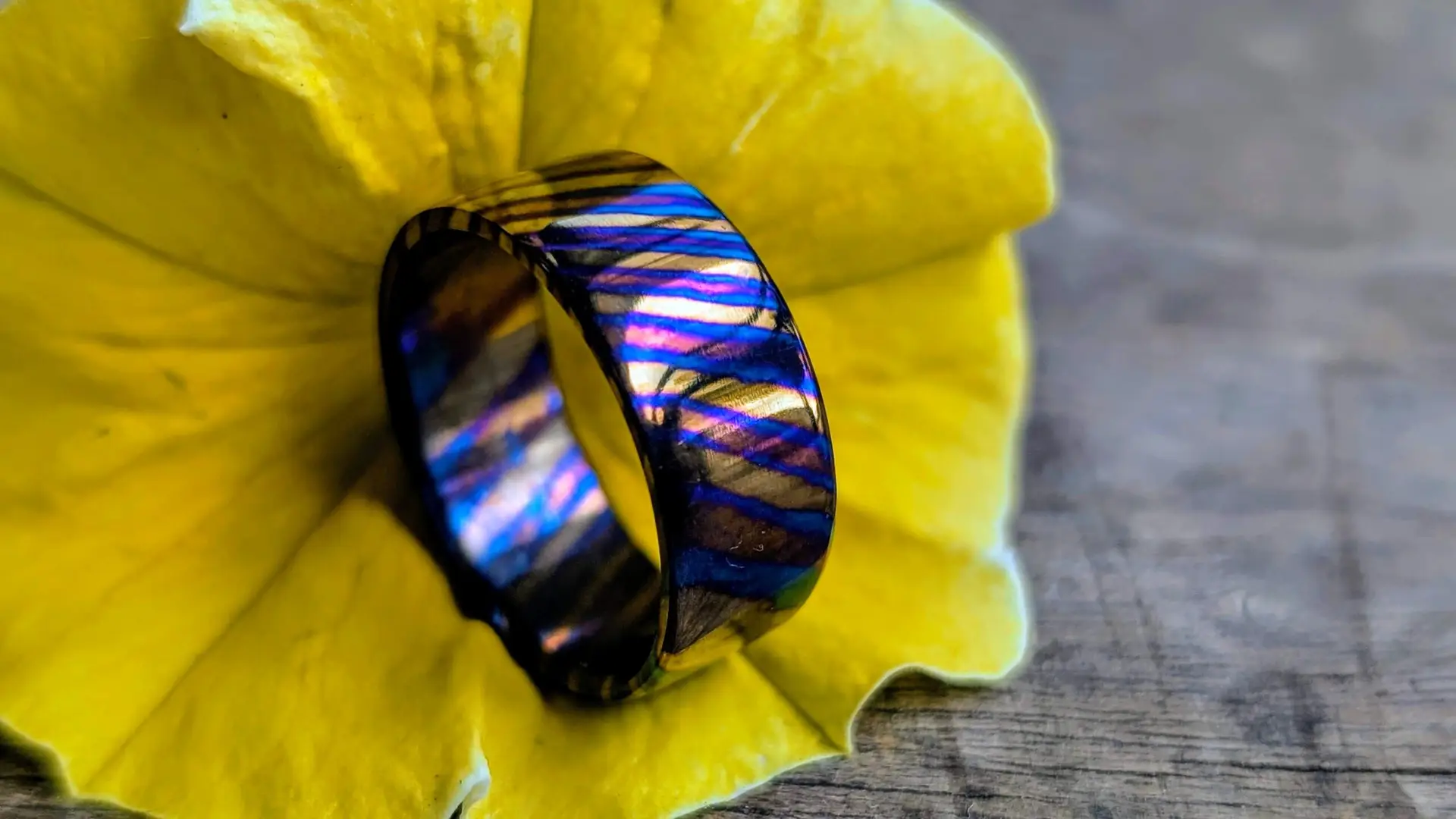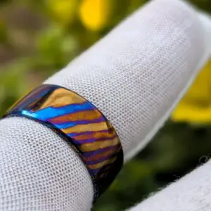 This ring is made from Timascus — a layered titanium damascus alloy known for its striking colours and rare character. Shaped by hand and heat-treated, the surface reveals natural stripes of purple, blue, and bronze. Each ring is one of a kind, its pattern defined by the unique twist and alloy mix within the metal itself.