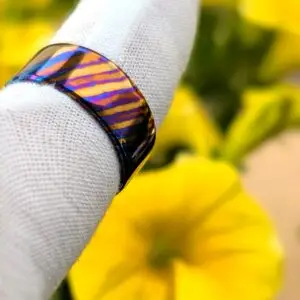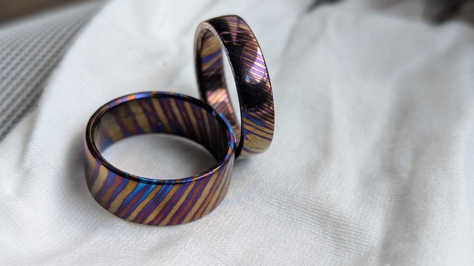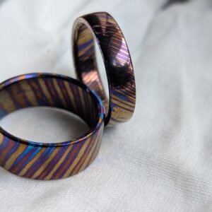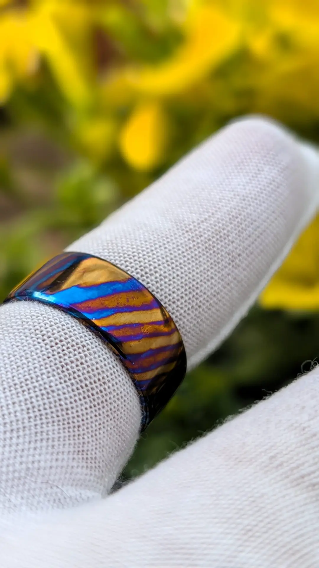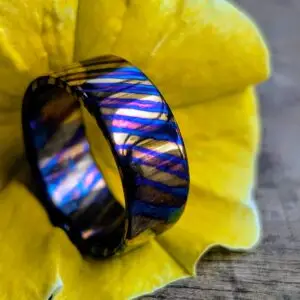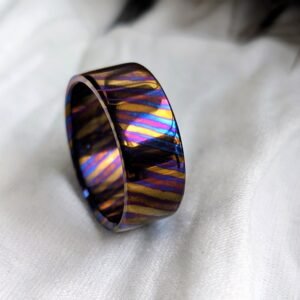 This ring is made from Timascus — a layered titanium damascus alloy known for its striking colours and rare character. Shaped by hand and heat-treated, the surface reveals natural stripes of purple, blue, and bronze. Each ring is one of a kind, its pattern defined by the unique twist and alloy mix within the metal itself.